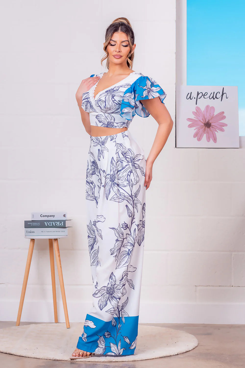 BLUE FLORAL 2 PIECE WIDE LEG PANT SET
